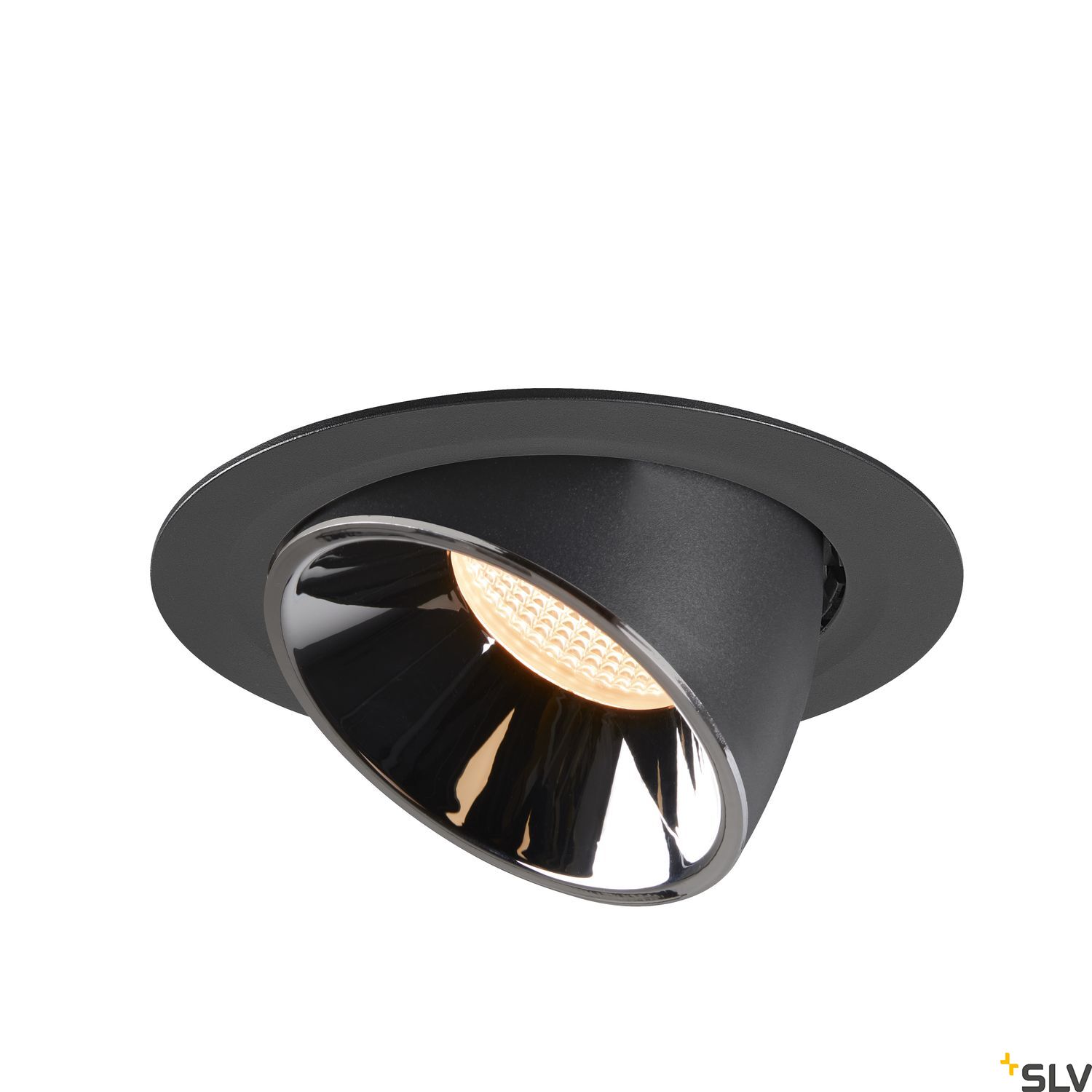 Diese SLV LED Deckeneinbauleuchte Numinos Gimble XL 1006034 hat eine Leistung von 37.4 Watt, bei einem Lichtstrom von 3400 Lumen, einer warmweißen Farbtemperatur von 2700 Kelvin und einen Abstrahlwinkel von 40 Grad, zudem lässt sie sich um 60 Grad schwenken und um 355 Grad drehen. Sie trägt ein hochwertiges Lampengehäuse aus Aluminium, in der Farbe schwarz, mit chrom farbigem Reflektor, hat eine hohe Qualität, worauf der Hersteller 5 Jahre Garantie gewährt und benötigt einen LED Treiber zum Anschluss an 230 Volt Netzspannung, welcher als Zubehör in dimmbar Phase, dimmbar Dali und nicht dimmbar angeboten wird, zudem stehen Einbaurahmen und Diffusoren für eine individuelle Lichtverteilung zur Auswahl. Die Lebensdauer ist mit 50.000 Stunden langlebig und die Farbwiedergabe mit einem CRI 90 natürlich, brillant. Er eignet sich für den Einbau in Decken mit einer Stärke von 0.7-2.5cm und trägt einen Einbaudurchmesser von 17.5cm, eine Einbautiefe von 13.5cm, der Durchmesser hingegen misst 19cm, mit einer Höhe von 13.5cm.