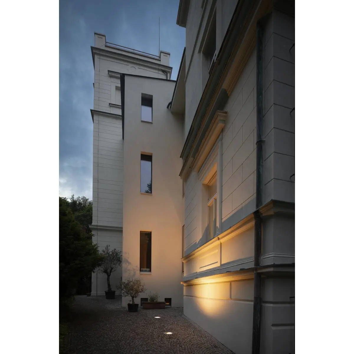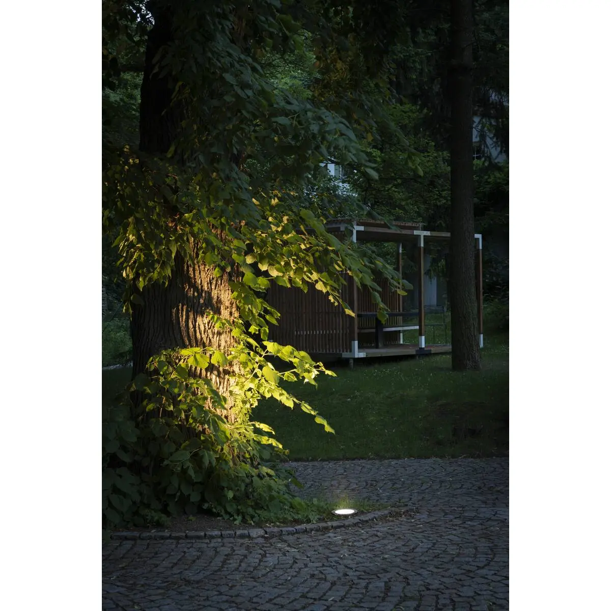 SLV Dasar L LED-Bodeneinbaustrahler 1009168 ist die professionelle Beleuchtung für moderne Außenanlagen und überzeugt funktional und lichttechnisch auf ganzer Linie. Er besitzt eine asymmetrische Lichtverteilung mit 70° nach oben und 40° zur Seite und ist zudem um 30° schwenkbar, was ihn ideal zur Beleuchtung von Wegen, Fassaden und Flächen macht. Außerdem ist er begeh- und befahrbar mit bis zu 2 Tonnen Tragkraft. Der SLV Dasar L LED-Bodeneinbaustrahler ist see- und salzluftbeständig und problemlos in Küstennähe einsetzbar. Zudem ist er dimmbar DALI und mit IP67 bestens vor Eindringen von Staub, Schmutz und Wasser geschützt, auch wenn er zeitweilig untergetaucht ist. Unser SLV Dasar L LED-Bodeneinbaustrahler leistet 19 Watt bei einem Lichtstrom von 1800 Lumen und einer warmweißen Farbtemperatur in 3000 Kelvin. Er trägt eine runde Form, ist aus hochwertigem Edelstahl gefertigt und besitzt eine lange Lebensdauer von 50.000 Stunden (L80B20), die der Hersteller zudem mit 5 Jahren Garantie absichert. Er ist für die Durchgangsverdrahtung vorbereitet und als externes Zubehör steht ein Montagegehäuse zur Verfügung.