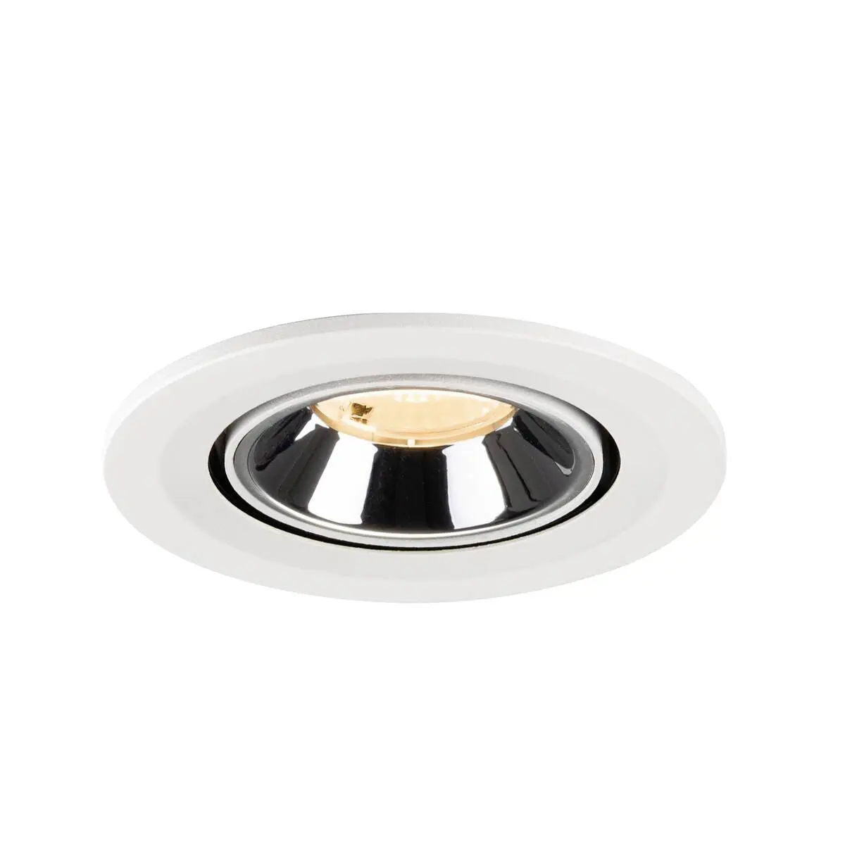 SLV Numinos Gimble S LED-Einbauleuchte 1009393 überzeugt mit einem weißen Gehäuse und Kontrast chromfarbigem Reflektor und ist als Highlight bis zu 60° schwenkbar und um 355° drehbar, was sie zu einer flexiblen Beleuchtungslösung macht. Ausgerüstet mit CRI 90 sorgt sie für eine natürlich brillante Farbwiedergabe und setzt den Innenraum so stilvoll in Szene, wobei sie mit UGR19 zudem nahezu blendfrei scheint. Die SLV Numinos Gimble S LED-Einbauleuchte leistet 6.7 Watt, bei einem Lichtstrom von 1000 Lumen, mit einer gemütlich warmweißen Farbtemperatur in 2700 Kelvin und einem Abstrahlwinkel in 40° und erzielt so effiziente 149 Lumen pro Watt. Mit einer hohen Qualität von 50.000 Lebensstunden in L90B10, gewährt der Hersteller zudem 5 Jahre Garantie. Unsere SLV Numinos Gimble S LED-Einbauleuchte besitzt ein Lampengehäuse aus hochwertigem Aluminium und misst einen Durchmesser von 10cm, einen Einbaudurchmesser mit 9cm sowie eine Einbautiefe in 7cm. Als Zubehör stehen ihr LED-Treiber in On/Off, dimmbar und DALI zur Verfügung - ebenso Diffusoren für verschiedene Lichtauslässe und Reflektoren für einen trendigen Look.