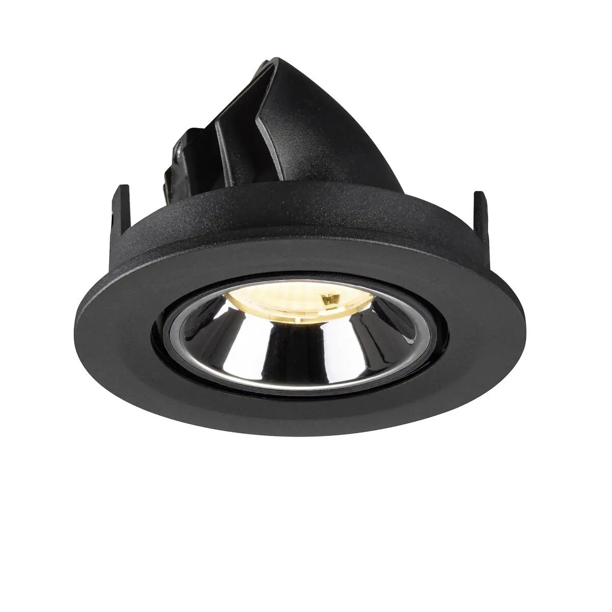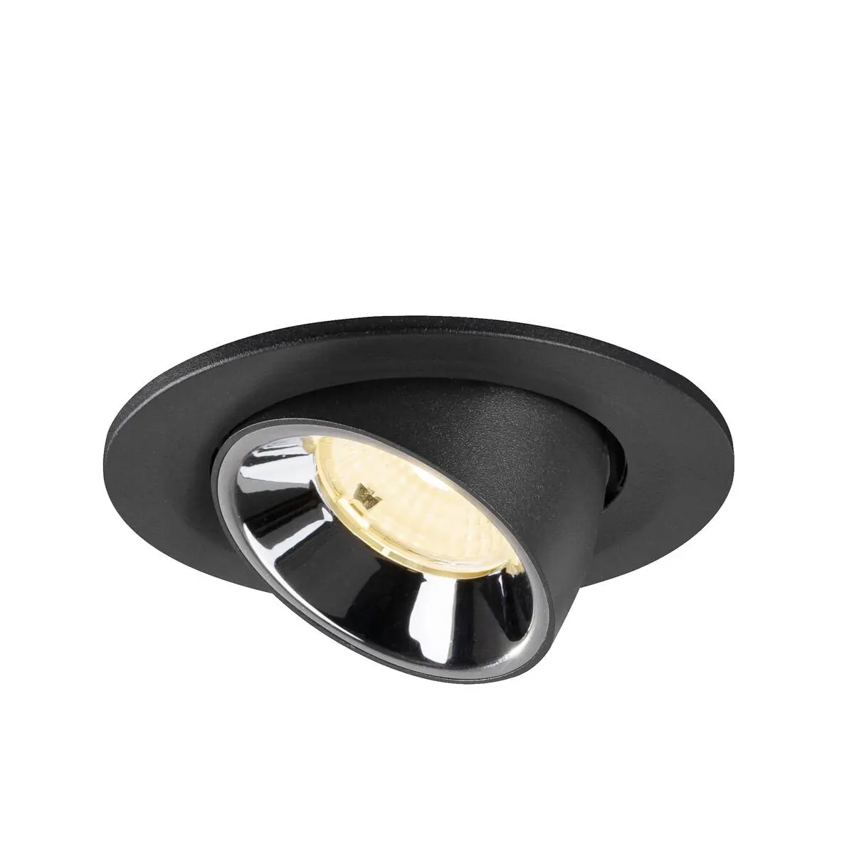 SLV Numinos Gimble S LED-Einbauleuchte 1009405 verleiht gelungenen Raumkonzepten mit schwarzem Gehäuse und Kontrast chromfarbenem Reflektor hochwertige Statements und ist als Highlight bis zu 60° schwenkbar und um 355° drehbar, was sie zu einer kreativen Lichtlösung macht. Ausgerüstet mit CRI 90 sorgt sie für eine natürlich brillante Farbwiedergabe und hebt den Innenraum so stilvoll in Szene. Die SLV Numinos Gimble S LED-Einbauleuchte leistet 6.7 Watt, bei einem Lichtstrom von 1050 Lumen, mit einer warmweißen Farbtemperatur in 3000 Kelvin und einem Abstrahlwinkel in 55° und erzielt so effiziente 156 Lumen pro Watt. Mit einer hohen Qualität von 50.000 Lebensstunden in L90B10, gewährt der Hersteller zudem 5 Jahre Garantie. Unsere SLV Numinos Gimble S LED-Einbauleuchte besitzt ein Lampengehäuse aus hochwertigem Aluminium und misst einen Durchmesser von 10cm, einen Einbaudurchmesser mit 9cm sowie eine Einbautiefe in 7cm. Als Zubehör werden LED-Treiber in On/Off, dimmbar und DALI angeboten - ebenso Diffusoren für diverse Lichtauslässe und Reflektoren für einen modernen Look.