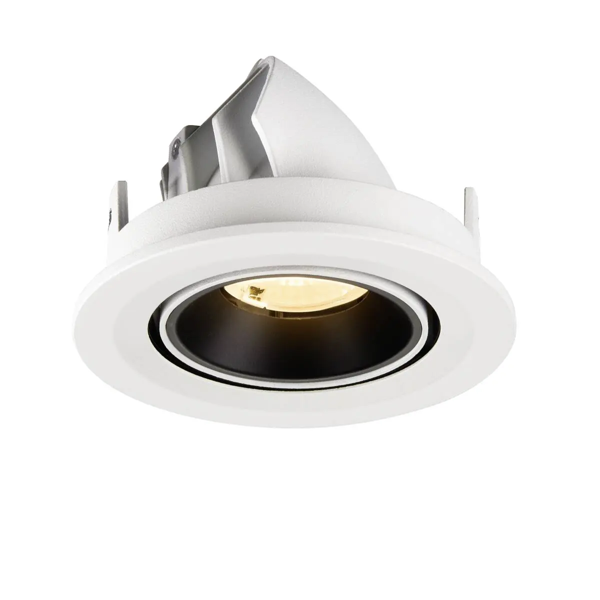 SLV Numinos Gimble S LED-Einbauleuchte 1009409 überzeugt mit einem weißen Gehäuse und Kontrast schwarzem Reflektor, wodurch sie moderne Statements in gelungenen Raumkonzepten setzt und lässt sich als Highlight um 60° schwenken und um 355° drehen. Ausgerüstet mit CRI 90 sorgt sie für eine natürlich brillante Farbwiedergabe und setzt das Interieur so stilvoll in Szene, wobei sie dieses mit UGR19 zudem nahezu blendfrei macht. Die SLV Numinos Gimble S LED-Einbauleuchte leistet 6.7 Watt, bei einem Lichtstrom von 1050 Lumen, mit einer warmweißen Farbtemperatur in 3000 Kelvin und einem Abstrahlwinkel in 40° und erzielt so effiziente 156 Lumen pro Watt. Ihre Qualität ist mit langlebigen 50.000 Stunden in L90B10 hoch, die der Hersteller zudem mit 5 Jahren Garantie absichert. Unsere SLV Numinos Gimble S LED-Einbauleuchte besitzt ein Lampengehäuse aus hochwertigem Aluminium und misst einen Durchmesser von 10cm, einen Einbaudurchmesser mit 9cm sowie eine Einbautiefe in 7cm. Als Zubehör stehen ihr LED-Treiber in On/Off, dimmbar und DALI zur Verfügung - ebenso Diffusoren für verschiedene Lichtauslässe und Reflektoren für einen trendigen Look.