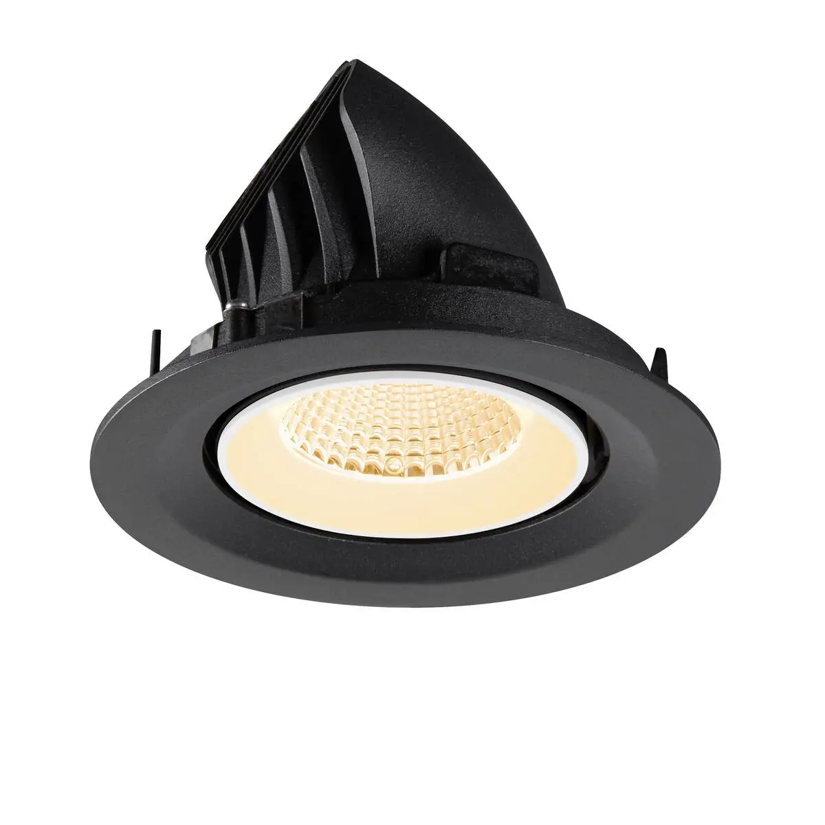 SLV Numinos Gimble M LED-Einbauleuchte 1009545 verleiht gelungenen Projekten mit schwarzem Gehäuse und Kontrast weiß abgesetztem Reflektor moderne Statements und ist als Highlight bis zu 60° schwenkbar und um 355° drehbar, wodurch sie sich optimal für eine flexible Ausleuchtung eignet. Ausgerüstet mit CRI 90 sorgt sie für eine natürlich brillante Farbwiedergabe und hebt das Raumambiente auf ein neues Level, wobei sie mit UGR19 zudem nahezu blendfrei scheint. Die SLV Numinos Gimble M LED-Einbauleuchte leistet 12 Watt, bei einem Lichtstrom 1700 Lumen, mit einer gemütlich warmweißen Farbtemperatur in 2700 Kelvin und einem Abstrahlwinkel in 40° und erzielt so effiziente 141 Lumen pro Watt. Mit einer hohen Qualität von 50.000 Lebensstunden in L90B10, gewährt der Hersteller zudem 5 Jahre Garantie. Unsere SLV Numinos Gimble M LED-Einbauleuchte besitzt ein Leuchtengehäuse aus hochwertigem Aluminium und misst einen Durchmesser von 13.5cm, einen Einbaudurchmesser mit 12cm sowie eine Einbautiefe in 9.5cm. Als Zubehör stehen ihr LED-Treiber in On/Off, dimmbar und DALI zur Verfügung - ebenso Diffusoren für verschiedene Lichtauslässe und Reflektoren für einen trendigen Look.
