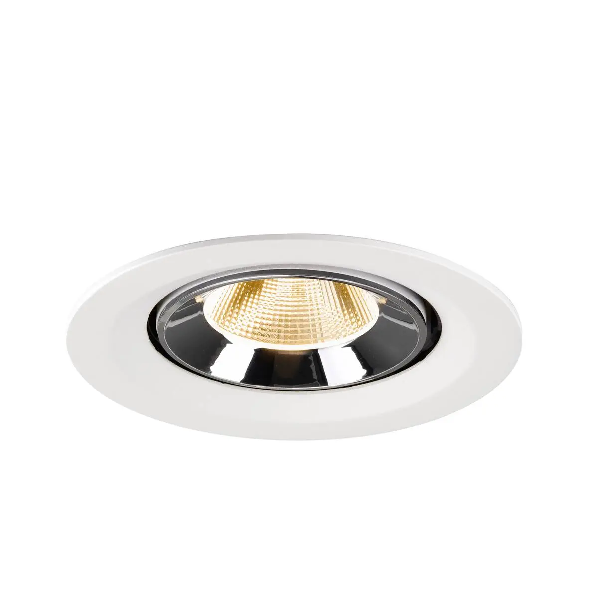 SLV Numinos Gimble M LED-Einbauleuchte 1009552 überzeugt in gelungenen Projekten mit weißem Gehäuse und Kontrast chromfarbig abgesetztem Reflektor auf ganzer Linie und ist als Highlight bis zu 60° schwenkbar und um 355° drehbar, was sie zu einer flexiblen Beleuchtungslösung macht. Ausgerüstet mit CRI 90 sorgt sie für eine natürlich brillante Farbwiedergabe und hebt die Inneneinrichtung so ins richtige Ambiente. Die SLV Numinos Gimble M LED-Einbauleuchte leistet 12 Watt, bei einem Lichtstrom von 1700 Lumen, mit einer gemütlich warmweißen Farbtemperatur in 2700 Kelvin und einem Abstrahlwinkel in 20° und erzielt so effiziente 141 Lumen pro Watt. Mit einer hohen Qualität von langlebigen 50.000 Stunden in L90B10, gewährt der Hersteller zudem 5 Jahre Garantie. Unsere SLV Numinos Gimble M LED-Einbauleuchte besitzt ein Leuchtengehäuse aus hochwertigem Aluminium und misst einen Durchmesser von 13.5cm, einen Einbaudurchmesser mit 12cm sowie eine Einbautiefe in 9.5cm. Als Zubehör stehen ihr LED-Treiber in On/Off, dimmbar und DALI zur Verfügung - ebenso Diffusoren für verschiedene Lichtauslässe und Reflektoren für einen trendigen Look.