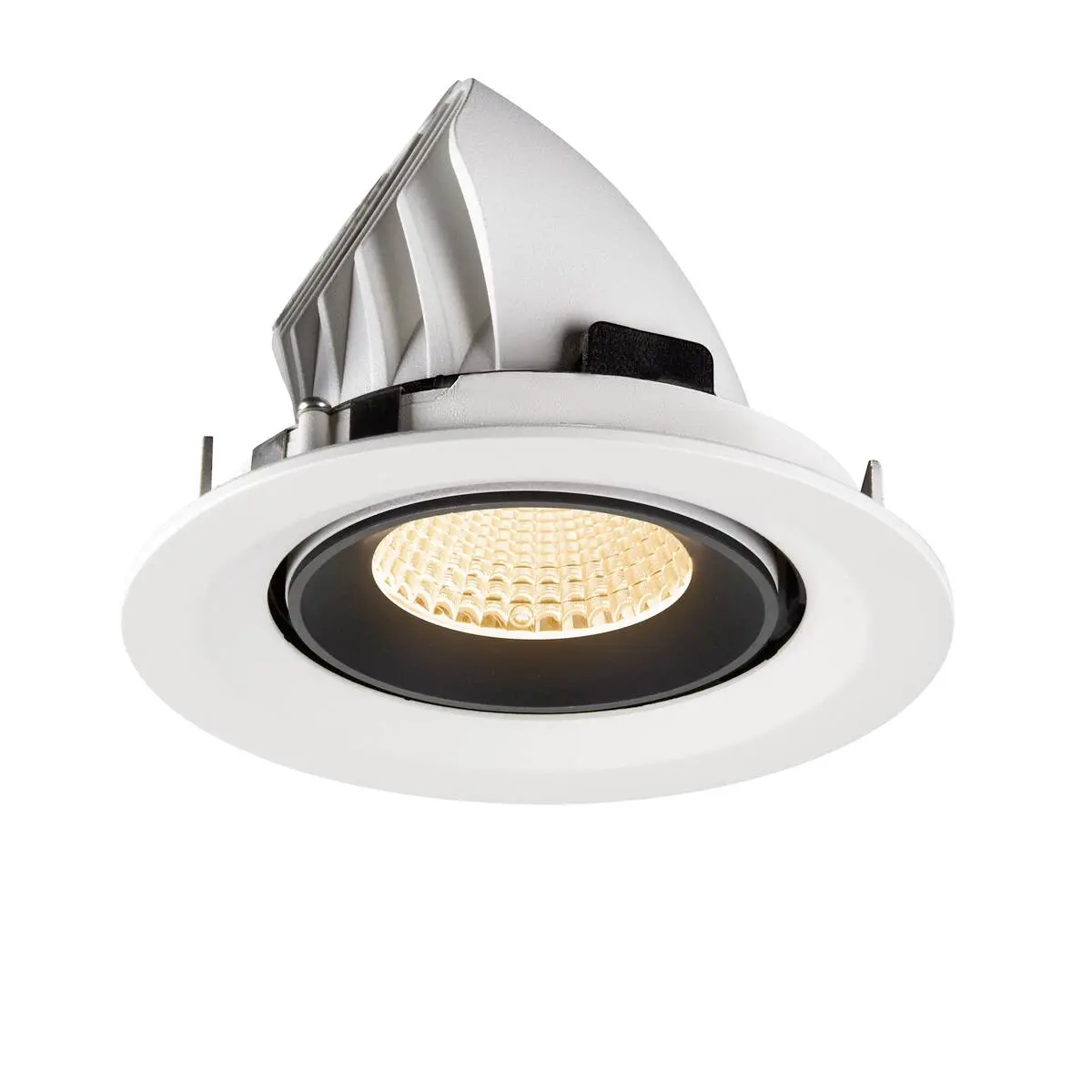 SLV Numinos Gimble M LED-Einbauleuchte 1009553 überzeugt mit einem modernen weißen Gehäuse und Kontrast schwarz abgesetztem Reflektor und ist als Highlight bis zu 60° schwenkbar und um 355° drehbar, wodurch sie sich optimale als flexible Beleuchtungslösung eignet. Ausgerüstet mit CRI 90 sorgt sie für eine natürlich brillante Farbwiedergabe und setzt den Innenraum so stilvoll in Szene, wobei sie mit dieses mit UGR19 zudem nahezu blendfrei macht. Die SLV Numinos Gimble M LED-Einbauleuchte leistet 12 Watt, bei einem Lichtstrom von 1700 Lumen, mit einer gemütlich warmweißen Farbtemperatur in 2700 Kelvin und einem Abstrahlwinkel in 40° und erzielt so effiziente 141 Lumen pro Watt. Mit einer hohen Qualität von 50.000 Stunden in L90B10, gewährt der Hersteller zudem 5 Jahre Garantie. Unsere SLV Numinos Gimble M LED-Einbauleuchte besitzt ein Lampengehäuse aus hochwertigem Aluminium und misst einen Durchmesser von 13.5cm, einen Einbaudurchmesser mit 12cm sowie eine Einbautiefe in 9.5cm. Als Zubehör stehen ihr LED-Treiber in On/Off, dimmbar und DALI zur Verfügung - ebenso Diffusoren für verschiedene Lichtauslässe und Reflektoren für einen trendigen Look.