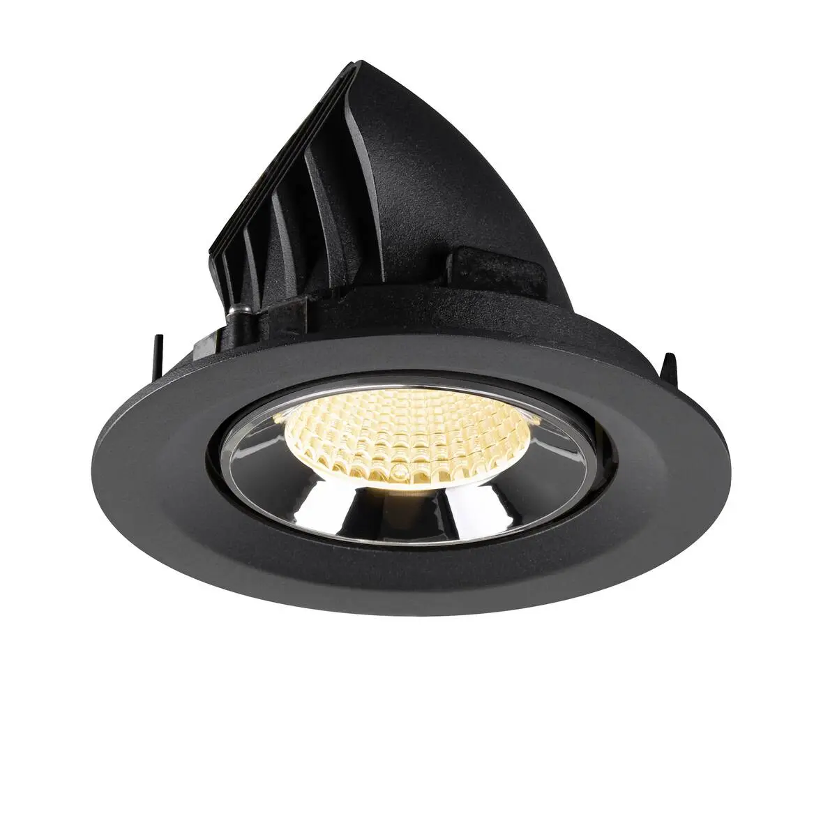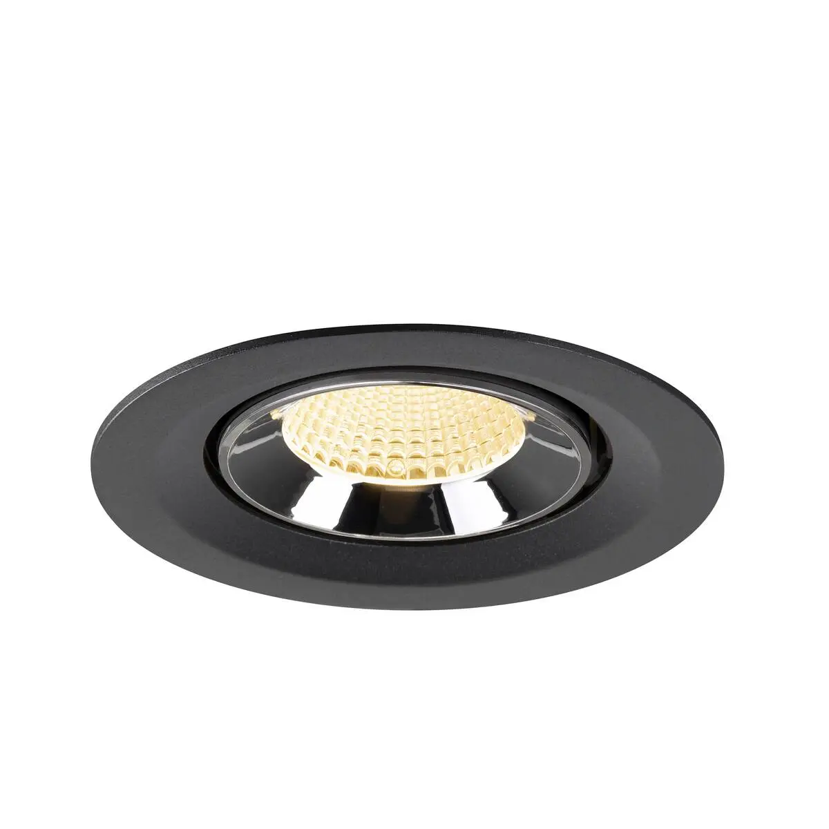 SLV Numinos Gimble M LED-Einbauleuchte 1009564 verleiht gelungenen Projekten mit schwarzen Gehäuse und Kontrast chromfarbigem Reflektor moderne Statements und lässt sich als Highlight bis zu 60° schwenken und um 355° drehen, was sie zu einer flexiblen Beleuchtungslösung macht. Ausgerüstet mit CRI 90 sorgt sie für eine natürlich brillante Farbwiedergabe und setzt das Interieur so bestmöglich in Szene, wobei sie dieses mit UGR19 zudem nahezu blendfrei macht. Die SLV Numinos Gimble M LED-Einbauleuchte leistet 12 Watt, bei einem Lichtstrom von 1800 Lumen, mit einer warmweißen Farbtemperatur in 3000 Kelvin und einem Abstrahlwinkel in 40° und erzielt so effiziente 150 Lumen pro Watt. Mit einer hohen Qualität von 50.000 Lebensstunden in L90B10, gewährt der Hersteller zudem 5 Jahre Garantie. Unsere SLV Numinos Gimble M LED-Einbauleuchte verfügt über ein Lampengehäuse aus hochwertigem Aluminium und misst einen Durchmesser von 13.5cm, einen Einbaudurchmesser mit 12cm sowie eine Einbautiefe in 9.5cm. Als Zubehör stehen ihr LED-Treiber in On/Off, dimmbar und DALI zur Verfügung - ebenso Diffusoren für verschiedene Lichtauslässe und Reflektoren für einen trendigen Look.