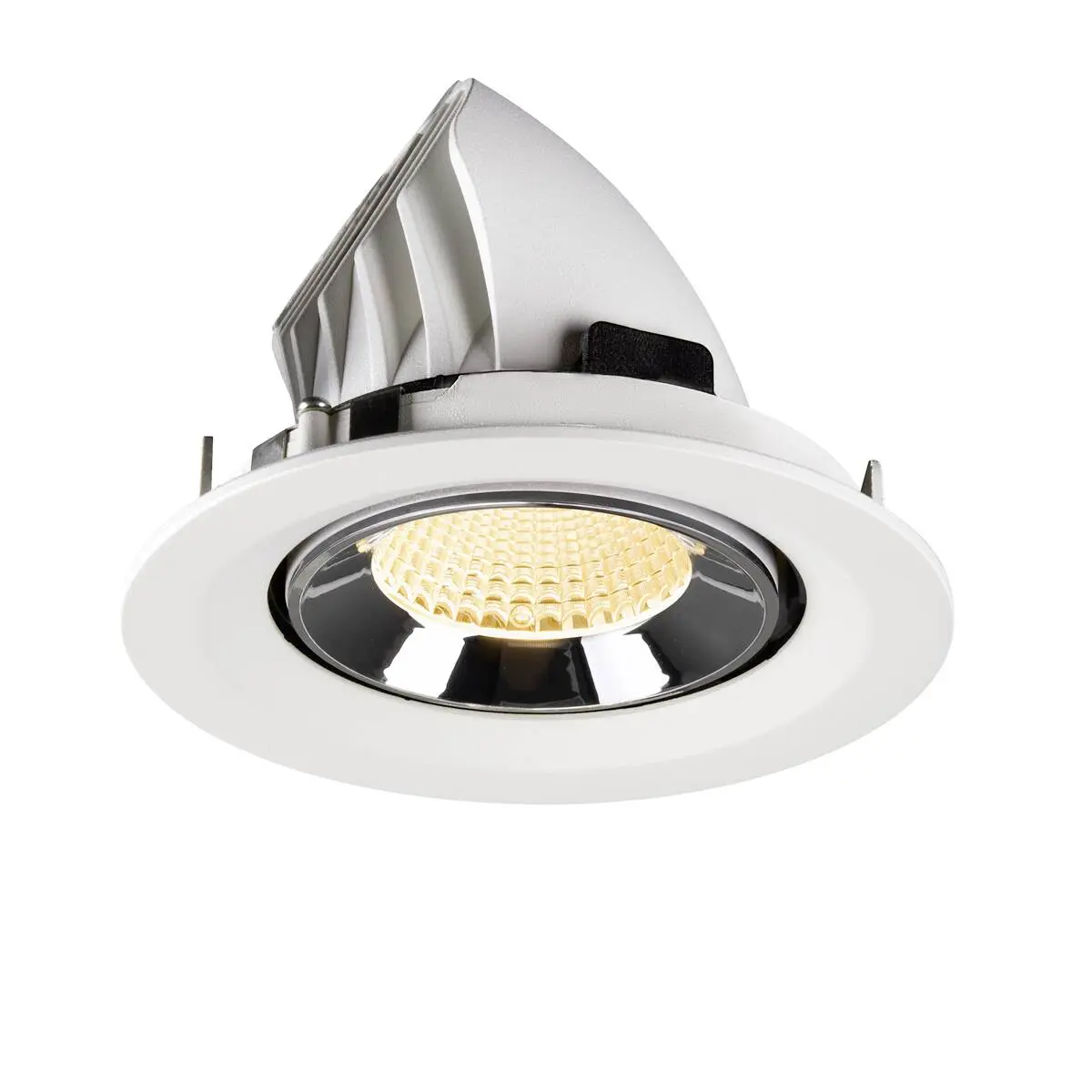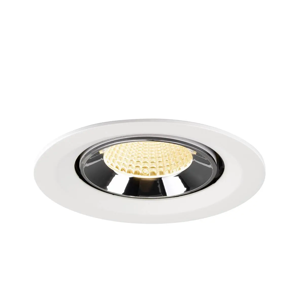 SLV Numinos Gimble M LED-Einbauleuchte 1009573 verleiht gelungenen Raumkonzepten mit weißem Gehäuse und Kontrast chromfarbig abgesetztem Reflektor hochwertige Statements und ist als Highlight bis zu 60° schwenkbar und um 355° drehbar, was sie zu einer flexiblen Beleuchtungslösung macht. Ausgerüstet mit CRI 90 sorgt sie für eine natürlich brillante Farbwiedergabe und hebt das Interieur ins richtige Ambiente, wobei sie dieses mit UGR19 zudem nahezu blendfrei macht. Die SLV Numinos Gimble M LED-Einbauleuchte leistet 12 Watt, bei einem Lichtstrom von 1800 Lumen, mit einer warmweißen Farbtemperatur in 3000 Kelvin und einem Abstrahlwinkel in 40° und erzielt so effiziente 150 Lumen pro Watt. Mit einer hohen Qualität von 50.000 Lebensstunden in L90B10, gewährt der Hersteller zudem 5 Jahre Garantie. Unsere SLV Numinos Gimble M LED-Einbauleuchte verfügt über ein Leuchtengehäuse aus hochwertigem Aluminium und misst einen Durchmesser von 13.5cm, einen Einbaudurchmesser mit 12cm sowie eine Einbautiefe in 9.5cm. Als Zubehör stehen ihr LED-Treiber in On/Off, dimmbar und DALI zur Verfügung - ebenso Diffusoren für verschiedene Lichtauslässe und Reflektoren für einen trendigen Look.