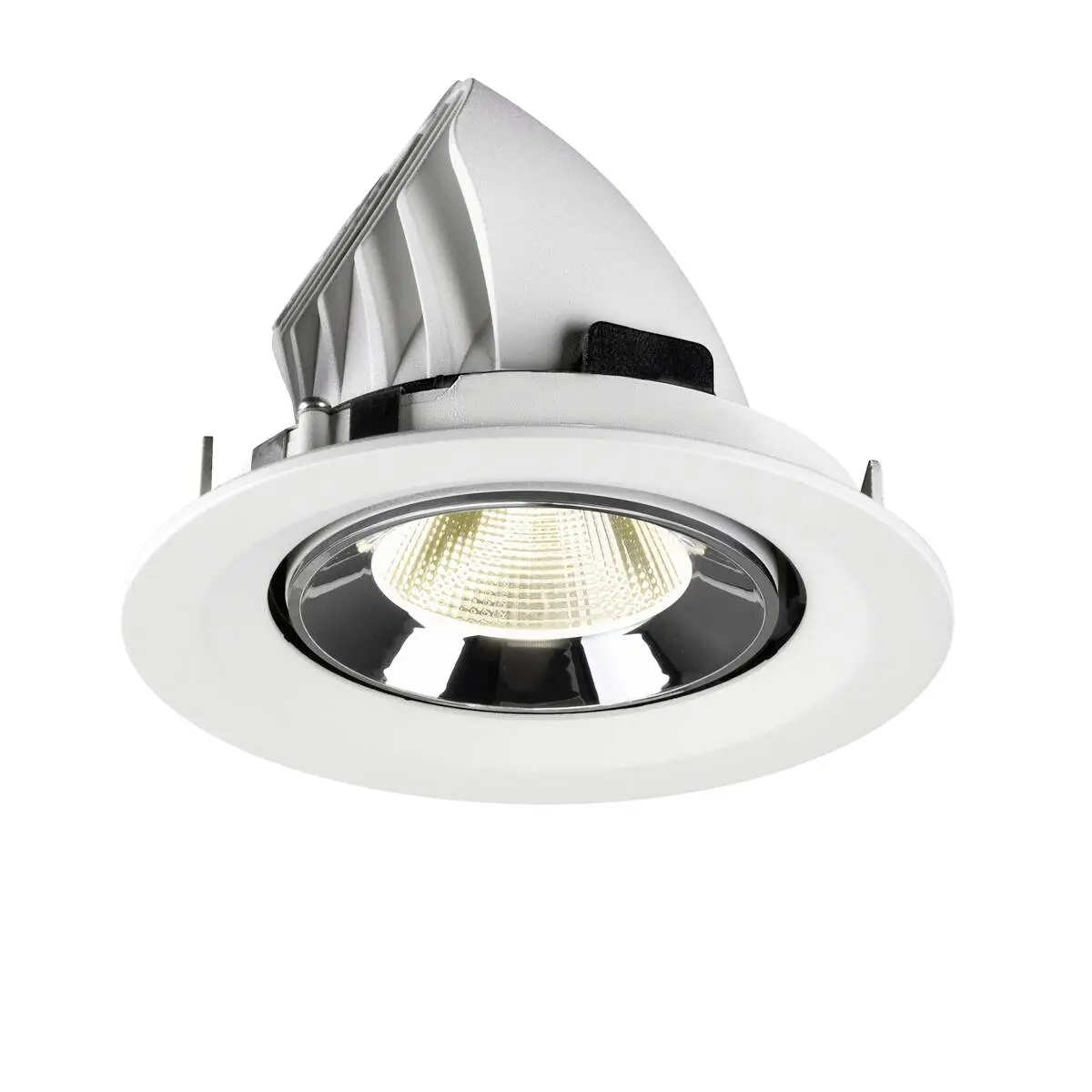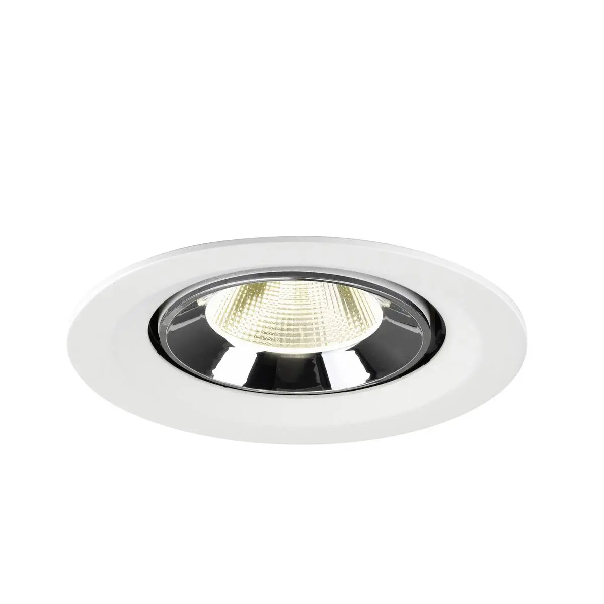 SLV Numinos Gimble M LED-Einbauleuchte 1009588 verleiht gelungenen Raumkonzepten mit weißem Gehäuse und Kontrast chromfarbig abgesetztem Reflektor hochwertige Statements und lässt sich als Highlight bis zu 60° schwenken und um 355° drehen, was sie zu einer flexiblen Beleuchtungslösung macht. Ausgerüstet mit CRI 90 sorgt sie für eine natürlich brillante Farbwiedergabe und hebt den Innenraum ins richtige Ambiente. Die SLV Numinos Gimble M LED-Einbauleuchte leistet 12 Watt, bei einem Lichtstrom von 1900 Lumen, mit einer neutralweißen Farbtemperatur in 4000 Kelvin und einem Abstrahlwinkel in 20° und erzielt so effiziente 158 Lumen pro Watt. Mit einer hohen Qualität von 50.000 Lebensstunden in L90B10, gewährt der Hersteller zudem 5 Jahre Garantie. Unsere SLV Numinos Gimble M LED-Einbauleuchte besitzt ein Leuchtengehäuse aus hochwertigem Aluminium und misst einen Durchmesser von 13.5cm, einen Einbaudurchmesser mit 12cm sowie eine Einbautiefe in 9.5cm. Als Zubehör stehen ihr LED-Treiber in On/Off, dimmbar und DALI zur Verfügung - ebenso Diffusoren für verschiedene Lichtauslässe und Reflektoren für einen trendigen Look.