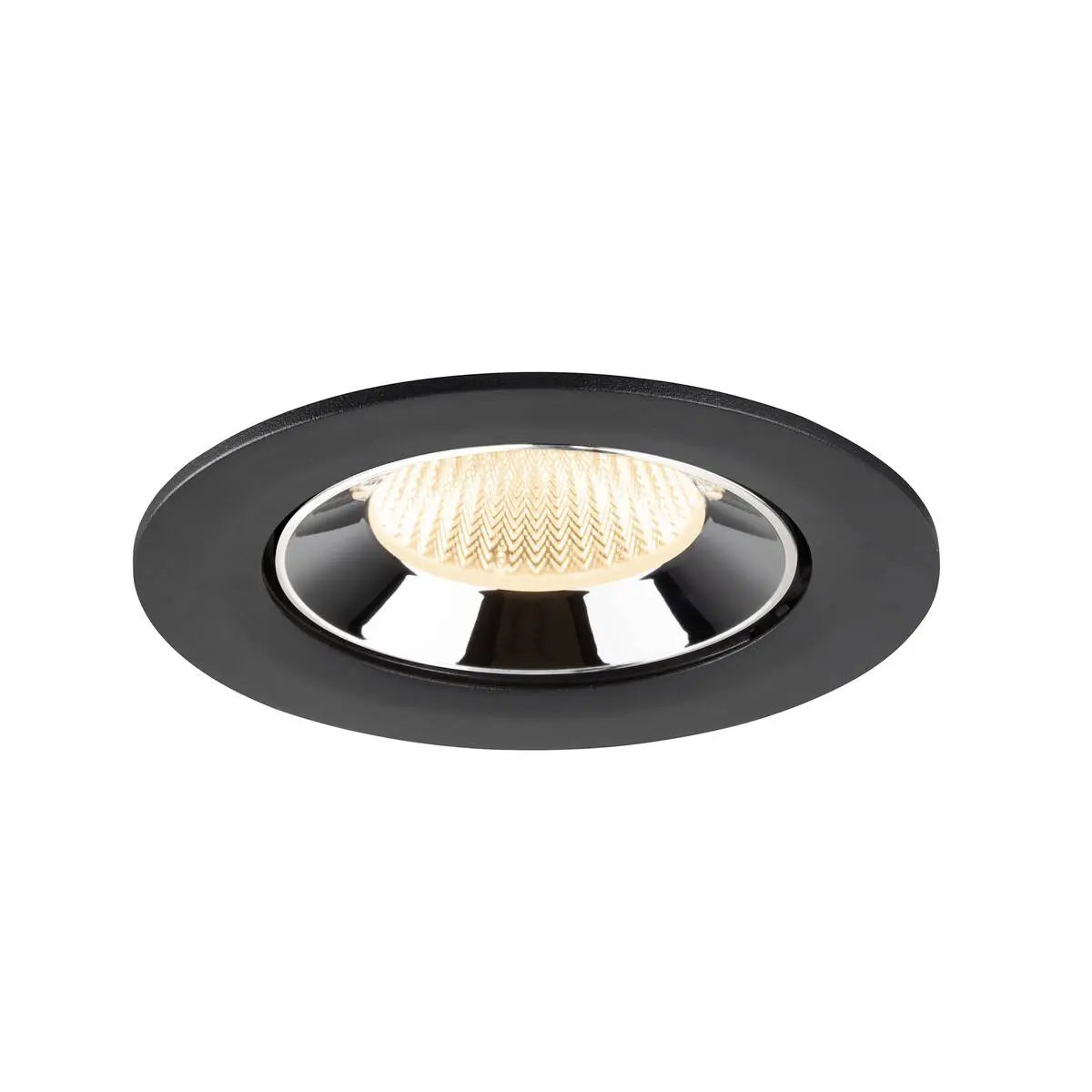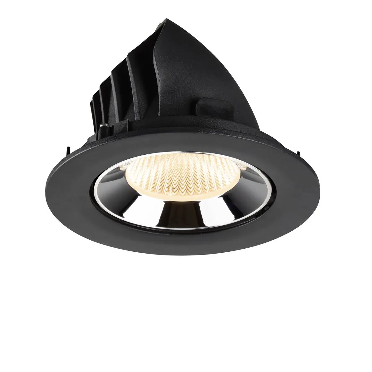 SLV Numinos Gimble L LED-Einbauleuchte 1009708 verleiht gelungenen Projekten mit schwarzem Gehäuse und Kontrast chromfarbig abgesetztem Reflektor hochwertige Statements und ist als Highlight bis zu 60° schwenkbar und um 355° drehbar, was sie zu einer flexiblen Beleuchtungslösung macht. Ausgerüstet mit CRI 90 sorgt sie für eine natürlich brillante Farbwiedergabe und setzt das Interieur so stilvoll in Szene. Die SLV Numinos Gimble L LED-Einbauleuchte leistet 17 Watt, bei einem Lichtstrom von 2400 Lumen, mit einer gemütlich warmweißen Farbtemperatur in 2700 Kelvin und einem Abstrahlwinkel in 40° und erzielt so effiziente 141 Lumen pro Watt. Mit einer hohen Qualität von 50.000 Lebensstunden in L90B10, gewährt der Hersteller zudem 5 Jahre Garantie. Unsere SLV Numinos Gimble L LED-Einbauleuchte besitzt ein Lampengehäuse aus hochwertigem Aluminium und misst einen Durchmesser von 16cm, einen Einbaudurchmesser mit 14.5cm sowie eine Einbautiefe in 11.5cm. Als Zubehör stehen ihr LED-Treiber in On/Off, dimmbar und DALI zur Verfügung - ebenso Diffusoren für verschiedene Lichtauslässe und Reflektoren für einen trendigen Look.
