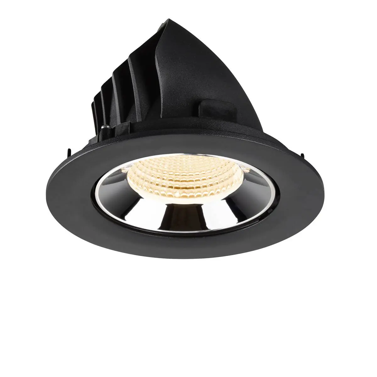 SLV Numinos Gimble L LED-Einbauleuchte 1009711 verleiht gelungenen Projekten mit schwarzem Gehäuse und Kontrast chromfarbig abgesetztem Reflektor hochwertige Statements und ist als Highlight bis zu 60° schwenkbar und um 355° drehbar, was sie zu einer flexiblen Beleuchtungslösung macht. Ausgerüstet mit CRI 90 sorgt sie für eine natürlich brillante Farbwiedergabe und setzt den Innenraum so stilvoll in Szene. Die SLV Numinos Gimble L LED-Einbauleuchte leistet 17 Watt, bei einem Lichtstrom von 2400 Lumen, mit einer gemütlich warmweißen Farbtemperatur in 2700 Kelvin und einem Abstrahlwinkel in 55° und erzielt so effiziente 141 Lumen pro Watt. Mit einer hohen Qualität von 50.000 Lebensstunden in L90B10, gewährt der Hersteller zudem 5 Jahre Garantie. Unsere SLV Numinos Gimble L LED-Einbauleuchte besitzt ein Lampengehäuse aus hochwertigem Aluminium und misst einen Durchmesser von 16cm, einen Einbaudurchmesser mit 14.5cm sowie eine Einbautiefe in 11.5cm. Als Zubehör stehen ihr LED-Treiber in On/Off, dimmbar und DALI zur Verfügung - ebenso Diffusoren für verschiedene Lichtauslässe und Reflektoren für einen trendigen Look.