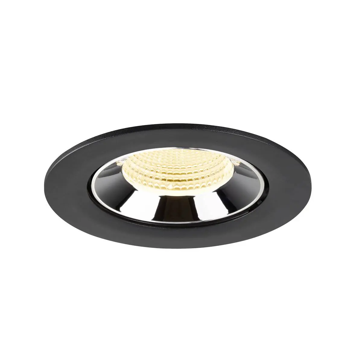 SLV Numinos Gimble L LED-Einbauleuchte 1009729 verleiht gelungenen Projekten mit schwarzem Gehäuse und Kontrast chromfarbig abgesetztem Reflektor hochwertige Statements und lässt sich als Highlight bis zu 60° schwenken und um 355° drehen, was sie zu einer flexiblen Beleuchtungslösung macht. Ausgerüstet mit CRI 90 sorgt sie für eine natürlich brillante Farbwiedergabe und hebt das Interieur stilvoll ins richtige Ambiente. Die SLV Numinos Gimble L LED-Einbauleuchte leistet 17 Watt, bei einem Lichtstrom von 2500 Lumen, mit einer warmweißen Farbtemperatur in 3000 Kelvin und einem Abstrahlwinkel in 55° und erzielt so effiziente 147 Lumen pro Watt. Ihre Qualität ist mit langlebigen 50.000 Stunden in L90B10 hoch, die der Hersteller zudem mit 5 Jahren Garantie absichert. Unsere SLV Numinos Gimble L LED-Einbauleuchte verfügt über ein Lampengehäuse aus hochwertigem Aluminium und misst einen Durchmesser von 16cm, einen Einbaudurchmesser mit 14.5cm sowie eine Einbautiefe in 11.5cm. Als Zubehör stehen ihr LED-Treiber in On/Off, dimmbar und DALI zur Verfügung - ebenso Diffusoren für verschiedene Lichtauslässe und Reflektoren für einen modernen Look.