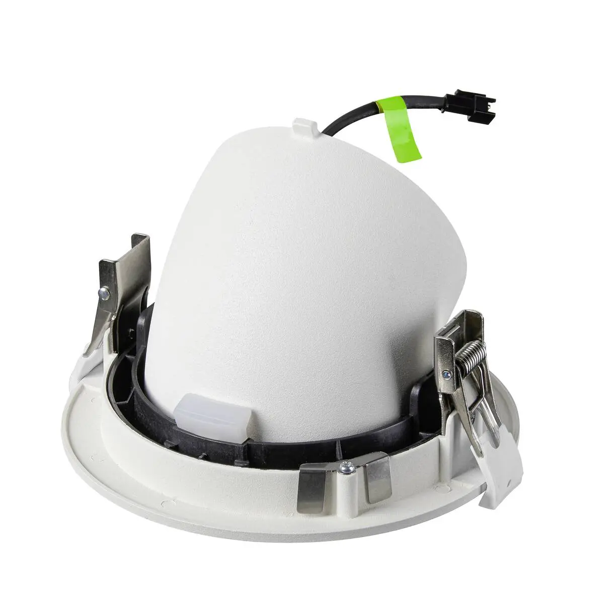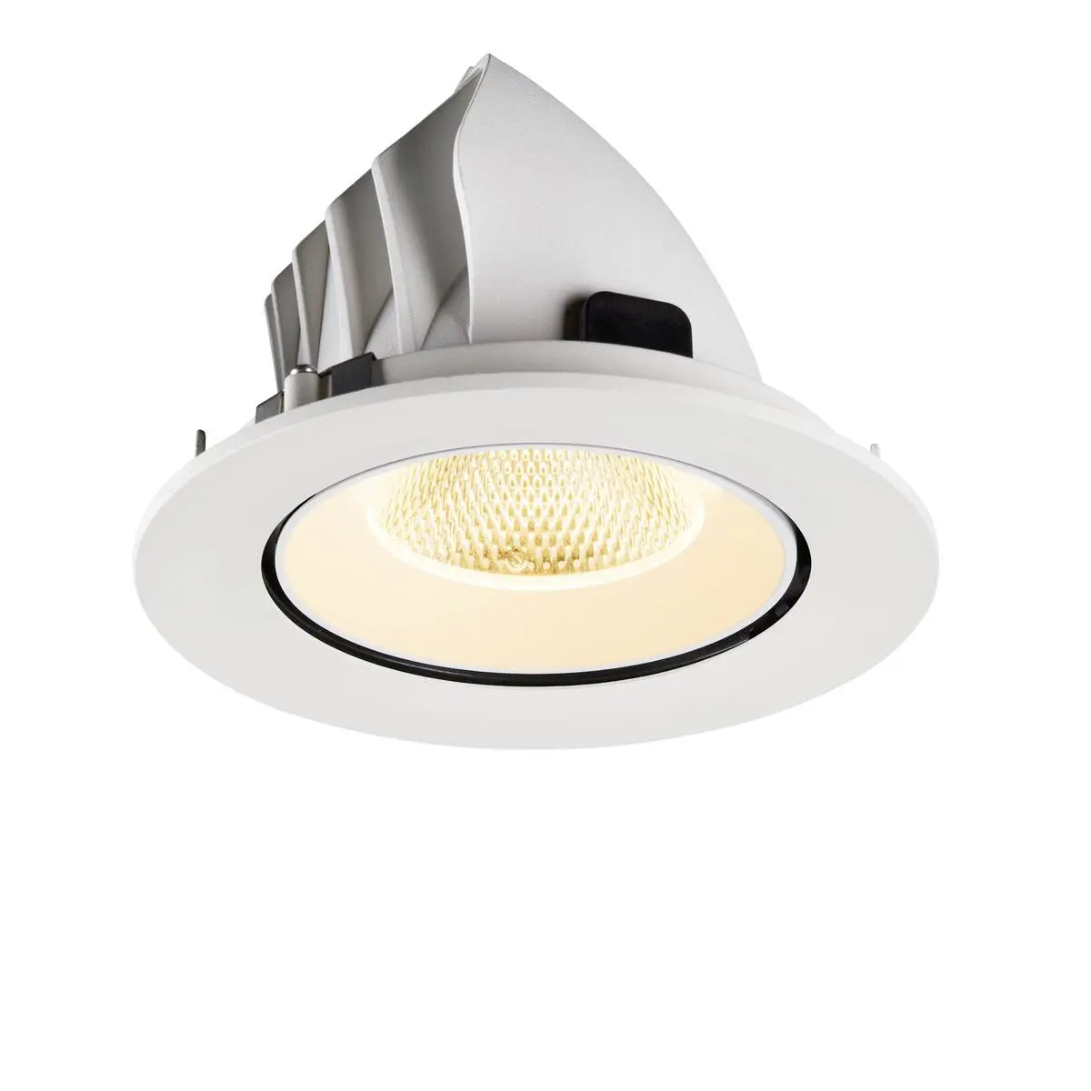 SLV Numinos Gimble L LED-Einbauleuchte 1009731 verleiht gelungenen Projekten mit Lichtqualität den nötigen Glanz und ist als Highlight bis zu 60° schwenkbar und um 355° drehbar, was sie zu einer flexiblen Beleuchtungslösung macht. Ausgerüstet mit CRI 90 sorgt sie für eine natürlich brillante Farbwiedergabe, wodurch sie den Innenraum bestmöglich in Szene setzt und mit UGR19 zudem nahezu blendfrei scheint. Die SLV Numinos Gimble L LED-Einbauleuchte leistet 17 Watt, bei einem Lichtstrom von 2500 Lumen, mit einer warmweißen Farbtemperatur in 3000 Kelvin und einem Abstrahlwinkel in 20° und erzielt so effiziente 147 Lumen pro Watt. Mit einer hohen Qualität von 50.000 Lebensstunden in L90B10, gewährt der Hersteller zudem 5 Jahre Garantie. Unsere SLV Numinos Gimble L LED-Einbauleuchte besitzt ein weißes Lampengehäuse aus hochwertigem Aluminium und misst einen Durchmesser von 16cm, einen Einbaudurchmesser mit 14.5cm sowie eine Einbautiefe in 11.5cm. Als Zubehör stehen ihr LED-Treiber in On/Off, dimmbar und DALI zur Verfügung - ebenso Diffusoren für verschiedene Lichtauslässe und Reflektoren für einen trendigen Look.