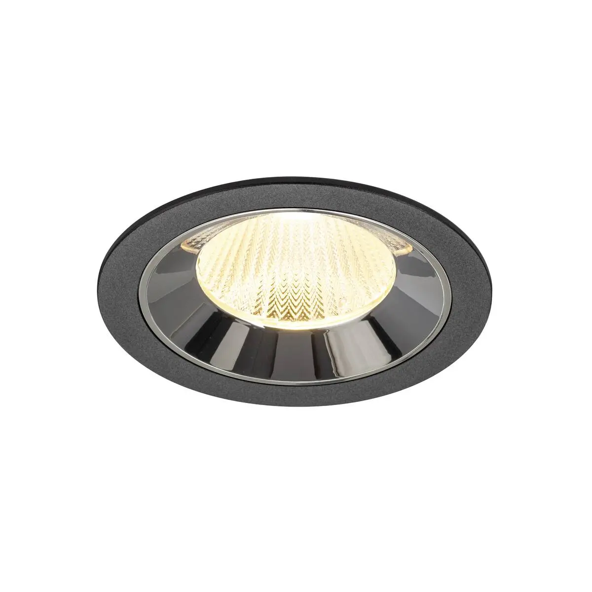 SLV Numinos L LED-Einbauspot 1009779 überzeugt mit einem sauber verarbeiteten, modern runden Design und setzt mit seinem schwarzen Gehäuse und Kontrast chromfarbenem Reflektor Designtrends in jedem Interieur. Ausgerüstet mit CRI 90 sorgt er für eine natürlich brillante Farbwiedergabe, wodurch er jeden Innenraum stilvoll in Szene setzt. Der SLV Numinos L LED-Einbauspot leistet 17 Watt, bei einem Lichtstrom von 2500 Lumen, mit einer warmweißen Farbtemperatur in 3000 Kelvin und einem Abstrahlwinkel in 40° und erzielt so effiziente 147 Lumen pro Watt. Seine Qualität ist mit langlebigen 50.000 Stunden in L90B10 hoch, die der Hersteller zudem mit 5 Jahren Garantie absichert. Unser SLV Numinos L LED-Einbauspot besitzt ein Lampengehäuse aus hochwertigem Aluminium und misst einen Durchmesser von 13cm, einen Einbaudurchmesser mit 12cm sowie eine Einbautiefe in 8.5cm. Des Weiteren werden als Zubehör LED-Treiber in On/Off, dimmbar und DALI angeboten - ebenso Diffusoren für kreative Lichtauslässe und Reflektoren für einen trendigen Look.