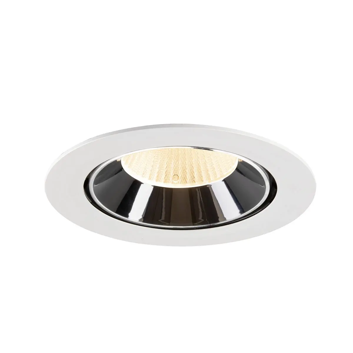 SLV Numinos Gimble XL LED-Einbauleuchte 1009878 verleiht gelungenen Raumkonzepten mit weißem Gehäuse und Kontrast chromfarbig abgesetztem Reflektor hochwertige Statements und lässt sich als Highlight bis zu 60° schwenken und um 355° drehen, was sie zu einer flexiblen Beleuchtungslösung macht. Ausgerüstet mit CRI 90 sorgt sie für eine natürlich brillante Farbwiedergabe und hebt den Innenraum ins richtige Ambiente, wobei sie dieses mit UGR19 zudem nahezu blendfrei macht. Die SLV Numinos Gimble XL LED-Einbauleuchte leistet 24 Watt, bei einem Lichtstrom von 3500 Lumen, mit einer gemütlich warmweißen Farbtemperatur in 2700 Kelvin und einem Abstrahlwinkel in 40° und erzielt so effiziente 145 Lumen pro Watt. Mit einer hohen Qualität von 50.000 Stunden in L90B10, gewährt der Hersteller 5 Jahre Garantie. Unsere SLV Numinos Gimble XL LED-Einbauleuchte verfügt über ein Leuchtengehäuse aus hochwertigem Aluminium und misst einen Durchmesser von 19cm, einen Einbaudurchmesser mit 17.5cm sowie eine Einbautiefe in 13.5cm. Als Zubehör stehen ihr LED-Treiber in On/Off, dimmbar und DALI zur Verfügung - ebenso Diffusoren für verschiedene Lichtauslässe und Reflektoren für einen trendigen Look.