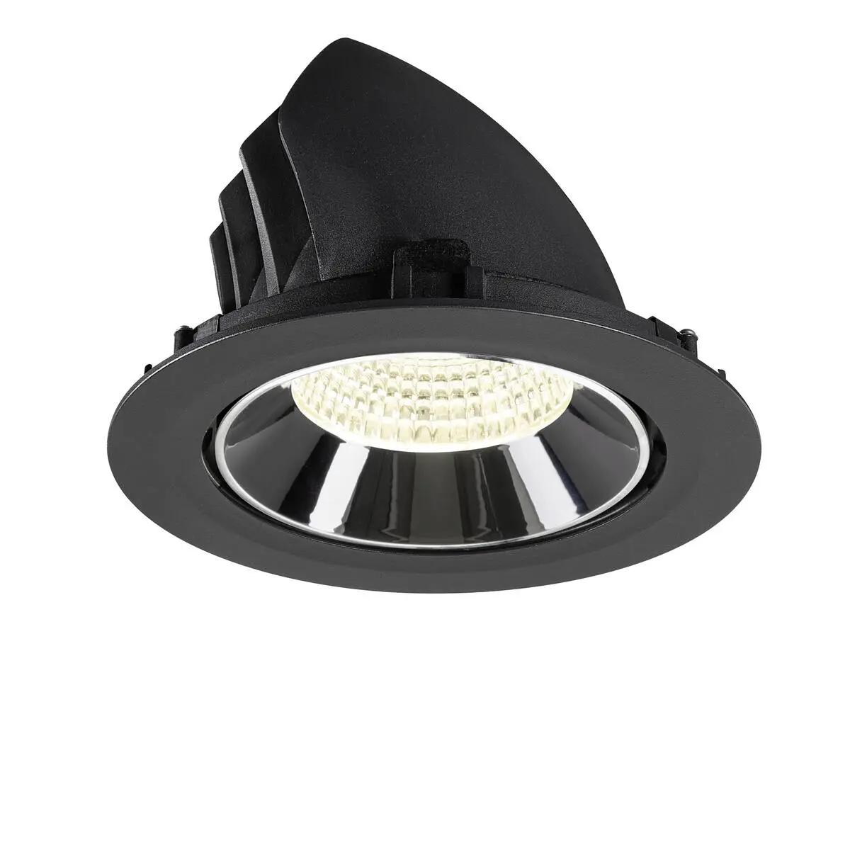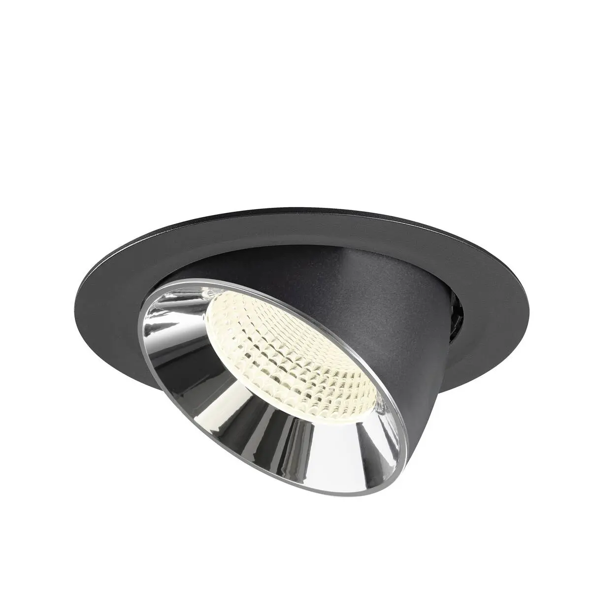SLV Numinos Gimble XL LED-Einbauleuchte 1009908 verleiht gelungenen Projekten mit schwarzem Gehäuse und Kontrast chromfarbig abgesetztem Reflektor hochwertige Statements und ist als Highlight bis zu 60° schwenkbar und um 355° drehbar, was sie zu einer flexiblen Beleuchtungslösung macht. Ausgerüstet mit CRI 90 sorgt sie für eine natürlich brillante Farbwiedergabe und hebt den Innenraum stilvoll ins richtige Ambiente. Die SLV Numinos Gimble XL LED-Einbauleuchte leistet 24 Watt, bei einem Lichtstrom von 3800 Lumen, mit einer neutralweißen Farbtemperatur in 4000 Kelvin und einem Abstrahlwinkel in 55° und erzielt so effiziente 158 Lumen pro Watt. Mit einer hohen Qualität von 50.000 Stunden in L90B10, gewährt der Hersteller zudem 5 Jahre Garantie. Unsere SLV Numinos Gimble XL LED-Einbauleuchte besitzt ein Lampengehäuse aus hochwertigem Aluminium und misst einen Durchmesser von 19cm, einen Einbaudurchmesser mit 17.5cm sowie eine Einbautiefe in 13.5cm. Als Zubehör stehen ihr LED-Treiber in On/Off, dimmbar und DALI zur Verfügung - ebenso Diffusoren für verschiedene Lichtauslässe und Reflektoren für einen trendigen Look.