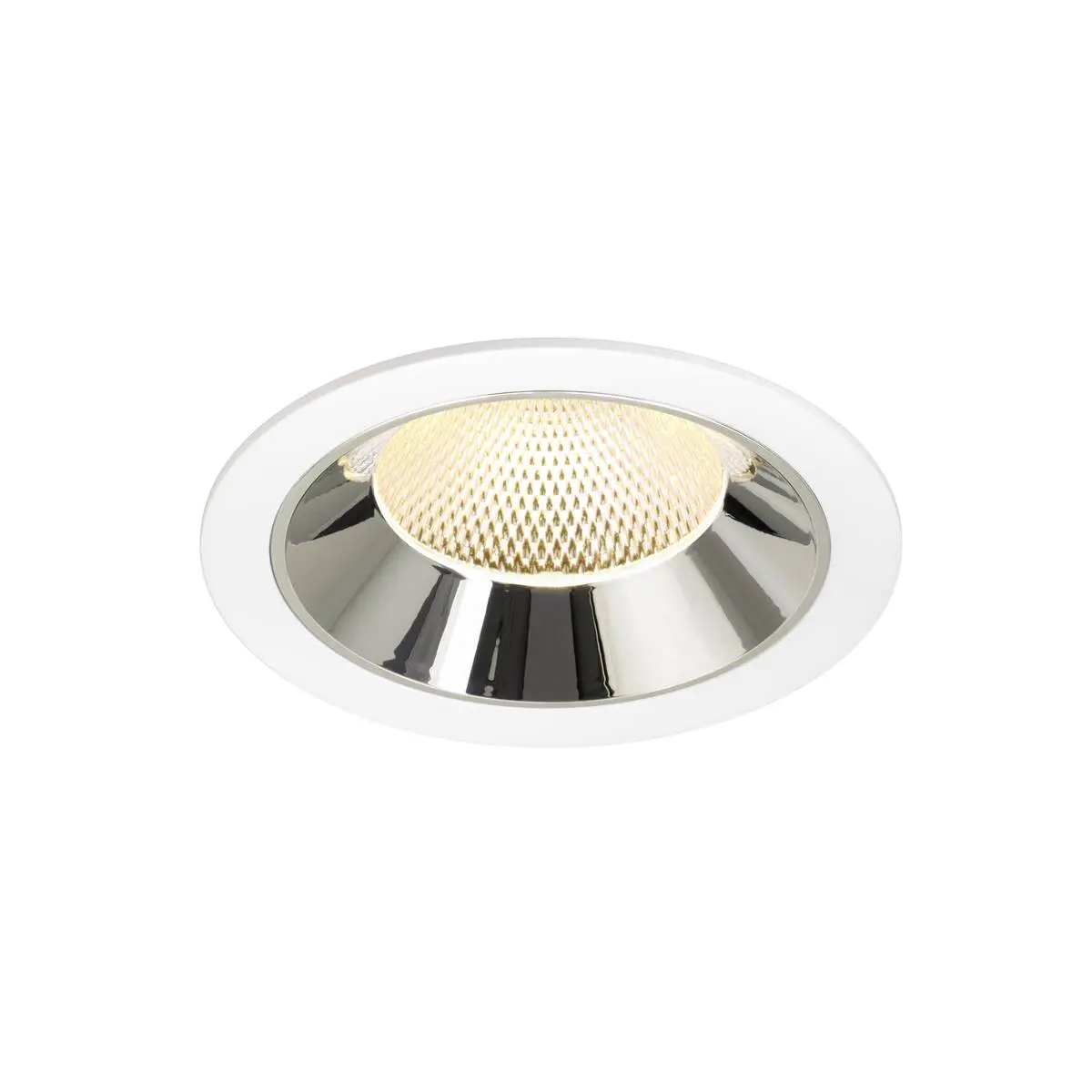 SLV Numinos XL LED-Einbauspot 1009950 ist als Highlight mit einem modern runden, sauber verarbeiteten Design ausgestattet und setzt mit seinem weißen Gehäuse und Kontrast chromfarbenem Reflektor hochwertige Statements in gelungenen Projekten. Ausgerüstet mit UGR 19 sorgt er für eine natürlich brillante Farbwiedergabe, wodurch er den Innenraum stilvoll in Szene setzt und mit UGR19 zudem nahezu blendfrei scheint. Der SLV Numinos XL LED-Einbauspot leistet 24 Watt, bei einem Lichtstrom von 3600 Lumen, mit einer warmweißen Farbtemperatur in 3000 Kelvin und einem Abstrahlwinkel in 40° und erzielt so effiziente 150 Lumen pro Watt. Seine Qualität ist mit langlebigen 50.000 Stunden in L90B10 hoch, die der Hersteller mit 5 Jahren Garantie absichert. Unser SLV Numinos XL LED-Einbauspot besitzt ein Lampengehäuse aus hochwertigem Aluminium und misst einen Durchmesser von 16cm, einen Einbaudurchmesser mit 14.5cm sowie eine Einbautiefe in 10.5cm. Als Zubehör stehen ihm LED-Treiber in On/Off, dimmbar und DALI zur Auswahl - ebenso Diffusoren fr kreative Lichtauslässe und Reflektoren für einen trendigen Look.