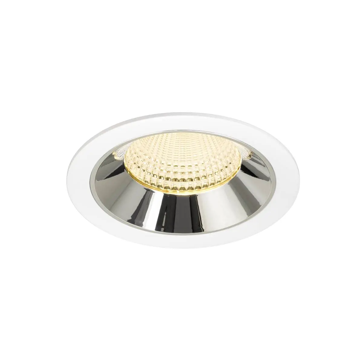 SLV Numinos XL LED-Einbauspot 1009953 sticht mit seiner sauberen Verarbeitung und modern runden Design selbstbewusst hervor und verleiht dem Innenraum mit seinem weißen Gehäuse und Kontrast chromfarbenem Reflektor hochwertige Statements. Ausgerüstet mit CRI 90 sorgt er für eine natürlich brillante Farbwiedergabe, wodurch er das Interieur stilvoll in Szene setzt. Der SLV Numinos XL LED-Einbauspot leistet 24 Watt, bei einem Lichtstrom von 3600 Lumen, mit einer warmweißen Farbtemperatur in 3000 Kelvin und einem Abstrahlwinkel in 55° und erzielt so effiziente 150 Lumen pro Watt. Mit einer hohen Qualität von 50.000 Lebensstunden in L90B10, gewährt der Hersteller zudem 5 Jahre Garantie. Unser SLV Numinos XL LED-Einbauspot besitzt ein Lampengehäuse aus hochwertigem Aluminium und misst einen Durchmesser von 16cm, einen Einbaudurchmesser mit 14.5cm sowie eine Einbautiefe in 10.5cm. Als Zubehör werden LED-Treiber in On/Off, dimmbar und DALI angeboten - ebenso Diffusoren für verschiedene Lichtauslässe und Reflektoren für einen trendigen Look.