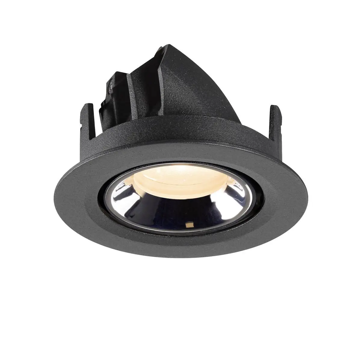 SLV Numinos Gimble XS LED-Einbauleuchte 1010028 überzeugt mit einem schwarzen Gehäuse und Kontrast chromfarbenem Reflektor und lässt sich als Highlight bis zu 60° schwenken und um 355° drehen, was sie zu einer kreativen Beleuchtungslösung macht. Ausgerüstet mit CRI 90 sorgt sie für eine natürlich brillante Farbwiedergabe und stellt den Innenraum bestmöglich in Szene, wobei sie dieses mit UGR19 zudem nahezu blendfrei macht. Die SLV Numinos Gimble XS LED-Einbauleuchte leistet 6.9 Watt, bei einem Lichtstrom von 900 Lumen, mit einer gemütlich warmweißen Farbtemperatur in 2700 Kelvin und einem Abstrahlwinkel in 20° und erzielt so effiziente 130 Lumen pro Watt. Mit einer hohen Qualität von 50.000 Lebensstunden in L90B10, gewährt der Hersteller zudem 5 Jahre Garantie. Unsere SLV Numinos Gimble XS LED-Einbauleuchte besitzt ein Leuchtengehäuse aus hochwertigem Aluminium und misst einen Durchmesser von 8cm, einen Einbaudurchmesser mit 6.8cm sowie eine Einbautiefe in 8cm. Als Zubehör stehen ihr LED-Treiber in On/Off, dimmbar und DALI zur Verfügung - ebenso Diffusoren für diverse Lichtauslässe und Reflektoren für einen trendigen Look.