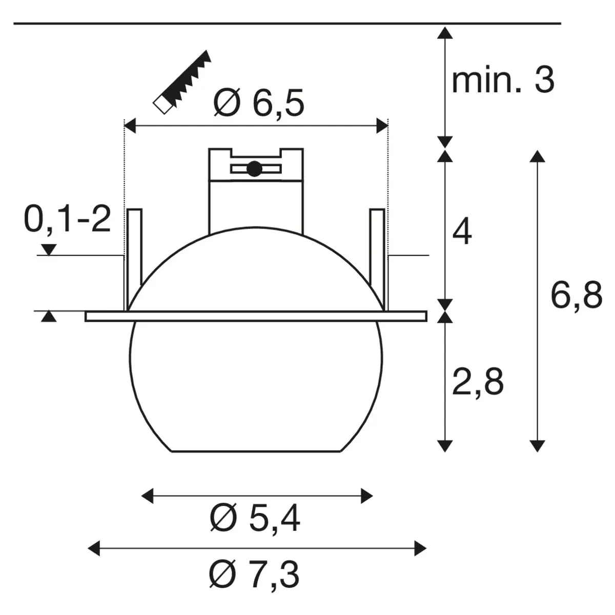 SLV Dysko LED-Einbaustrahler 1010353 trägt einen Retro-Stil und kommt mit einem besonderen Diskokugel Design in der Trendfarbe gold zum Einsatz, wodurch er einen modernen Lichtflair im Raum erzeugt. Für eine optimale Ausrichtung ist er um 360° drehbar und um 90° schwenkbar und lässt sich mit einem Phasenabschnitts-Dimmer dimmen. Der SLV Dysko LED-Einbaustrahler leistet 6.4 Watt, bei einem Lichtstrom von 750 Lumen und einer gemütlich warmweißen Farbtemperatur in 2700 Kelvin. Seine Qualität ist mit 50.000 Stunden hoch, die der Hersteller zusätzlich mit 5 Jahren Garantie absichert. Ausgerüstet mit CRI 90 schafft er eine natürlich, brillante Farbwiedergabe im Raum. Unser SLV Dysko LED-Einbaustrahler trägt ein Lampengehäuse aus hochwertigem Aluminium und misst einen Durchmesser von 7.3cm, mit einer Höhe in 6.8. Der Einbaudurchmesser beträgt 6.5cm, mit einer Einbautiefe von 7cm.
