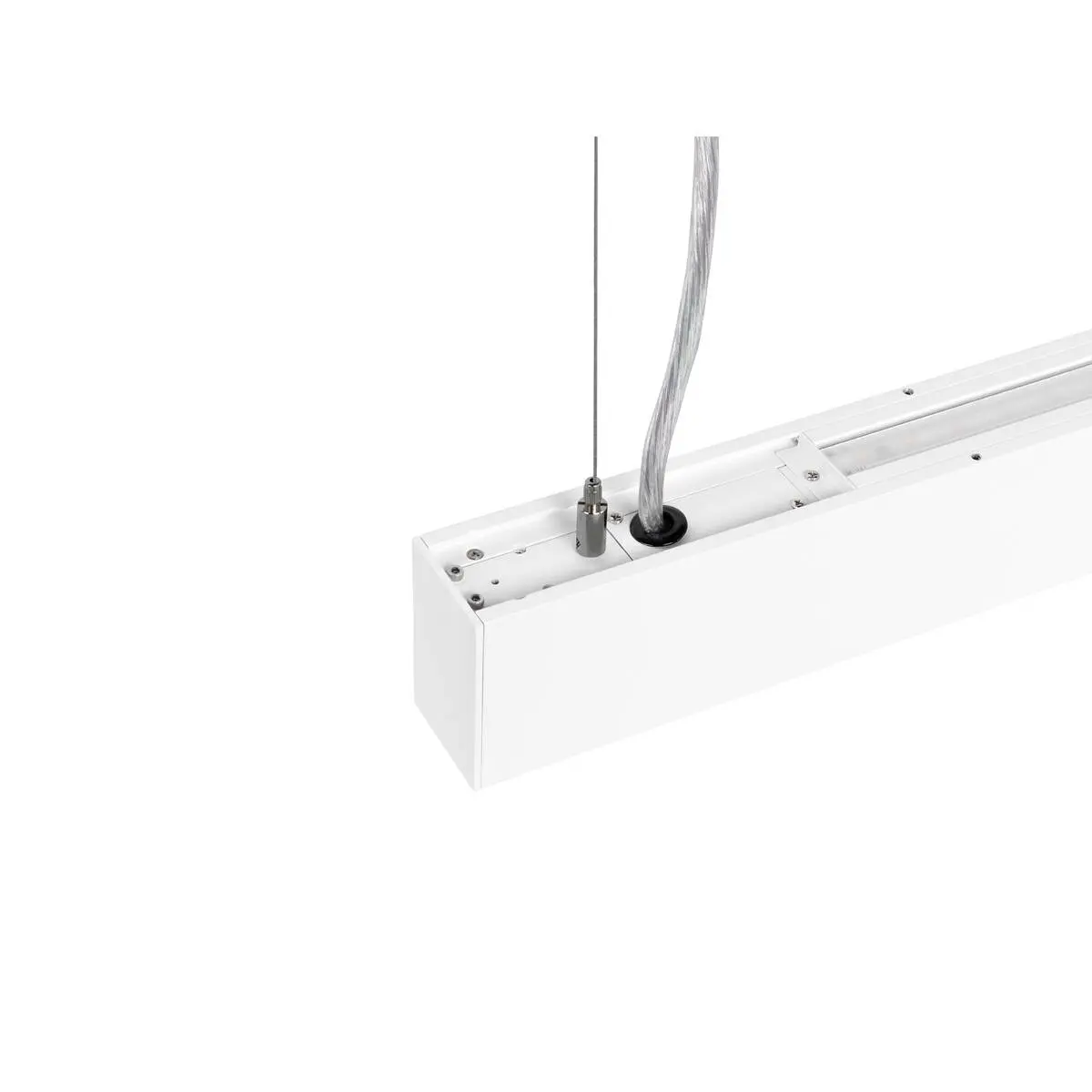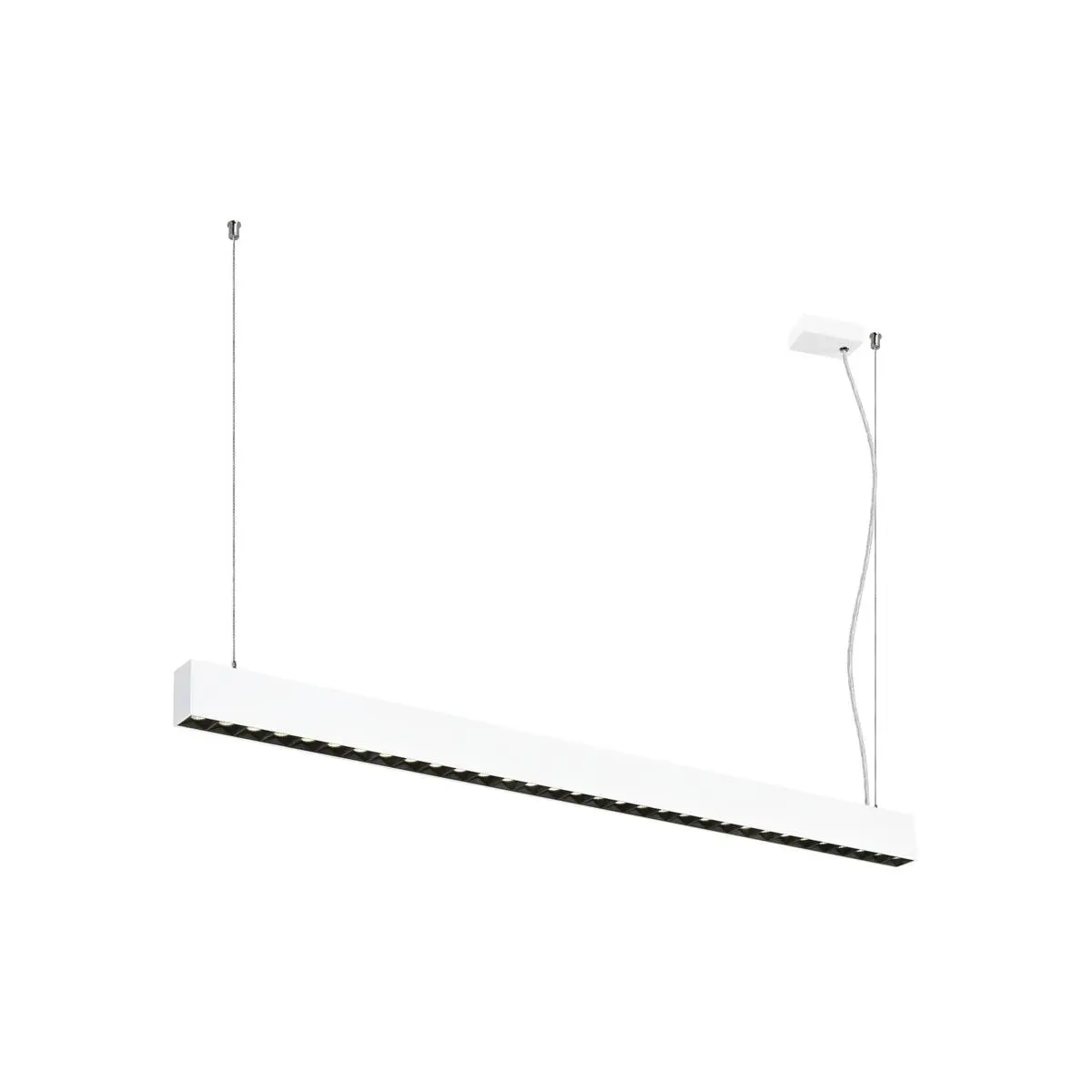 SLV Glenos Pro LED-Pendelleuchte 1010511 besitzt ein elegantes lineares Design, wobei das weiße Gehäuse mit einer Kontrast schwarz rückversetzten Lichtquelle versehen ist und mit Mikroreflektor und UGR16 nahezu blendfrei leuchtet. Mit einem indirekten Lichtanteil nach oben, sorgt sie zudem für viel Wohlfühlambiente. Sie ist durchgangsverdrahtet und wird mit Verbindungsmaterial geliefert, weshalb sich bis zu 30 Leuchten nahtlos miteinander verbinden lassen. Die SLV Glenos Pro LED-Pendelleuchte leistet 60 Watt, bei einem Lichtstrom von 7800 Lumen und einer neutralweißen Farbtemperatur in 4000 Kelvin und erzielt so effiziente 130 Lumen pro Watt. Ihr Qualität ist mit 50.000 Stunden in L80B10 hoch, die der Hersteller mit 5 Jahren Garantie absichert. Zudem ist sie DALI dimmbar und sorgt mit CRI 90 für eine natürlich, brillante Farbwiedergabe. Unsere SLV Glenos Pro LED-Pendelleuchte trägt ein Leuchtengehäuse aus hochwertigem Aluminium und misst eine Länge von 128.5cm, eine Breite mit 4.8cm sowie eine Höhe in 7.6cm und wird mit einer individuell einstellbaren Pendellänge von 210cm geliefert.