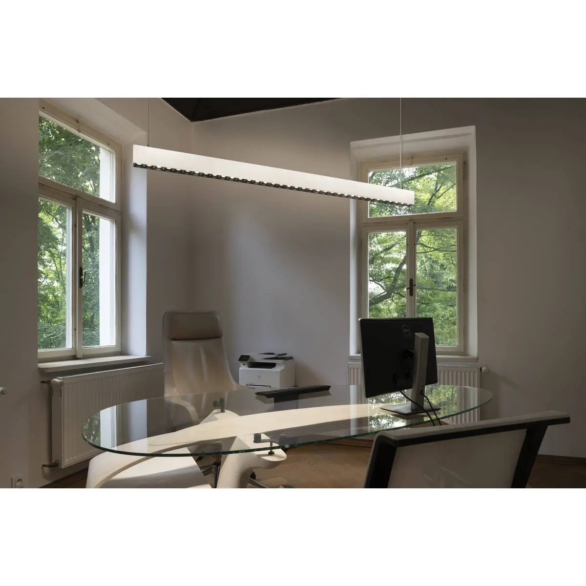 SLV Glenos Pro LED-Pendelleuchte 1010513 kommt mit einem weißen linearen Design zum Einsatz, wobei die Kontrast schwarze Lichtquelle leicht rückversetzt ist und mit Mikroreflektor und UGR16 nahezu blendfrei leuchtet. Der indirekte Lichtanteil mit einem Lichtschein nach oben sorgt zusätzlich für viel Wohlfühlambiente. Sie bietet den Vorteil mit integrierter Durchgangsverdrahtung und mitgeliefertem Verbindungsmaterial, bis zu 30 Leuchten nahtlos und ohne Lichtaustritt miteinander zu verbinden. Die SLV Glenos Pro LED-Pendelleuchte leistet 70 Watt, bei einem Lichtstrom von 8500 Lumen und einer warmweißen Farbtemperatur in 3000 Kelvin und erziel so effiziente 121 Lumen pro Watt. Ihre Qualität ist mit 50.000 Stunden in L80B10 hoch, die der Hersteller mit 5 Jahren Garantie absichert. Ausgerüstet mit CRI 90 sorgt sie für eine natürlich, brillante Farbwiedergabe und ist DALI dimmbar. Unsere SLV Glenos Pro LED-Pendelleuchte trägt ein Leuchtengehäuse aus hochwertigem Aluminium und misst eine Länge von 144.8cm, eine Breite mit 4.8cm sowie eine Höhe in 7.6cm und wird mit einer individuell einstellbaren Pendellänge von 210cm geliefert.