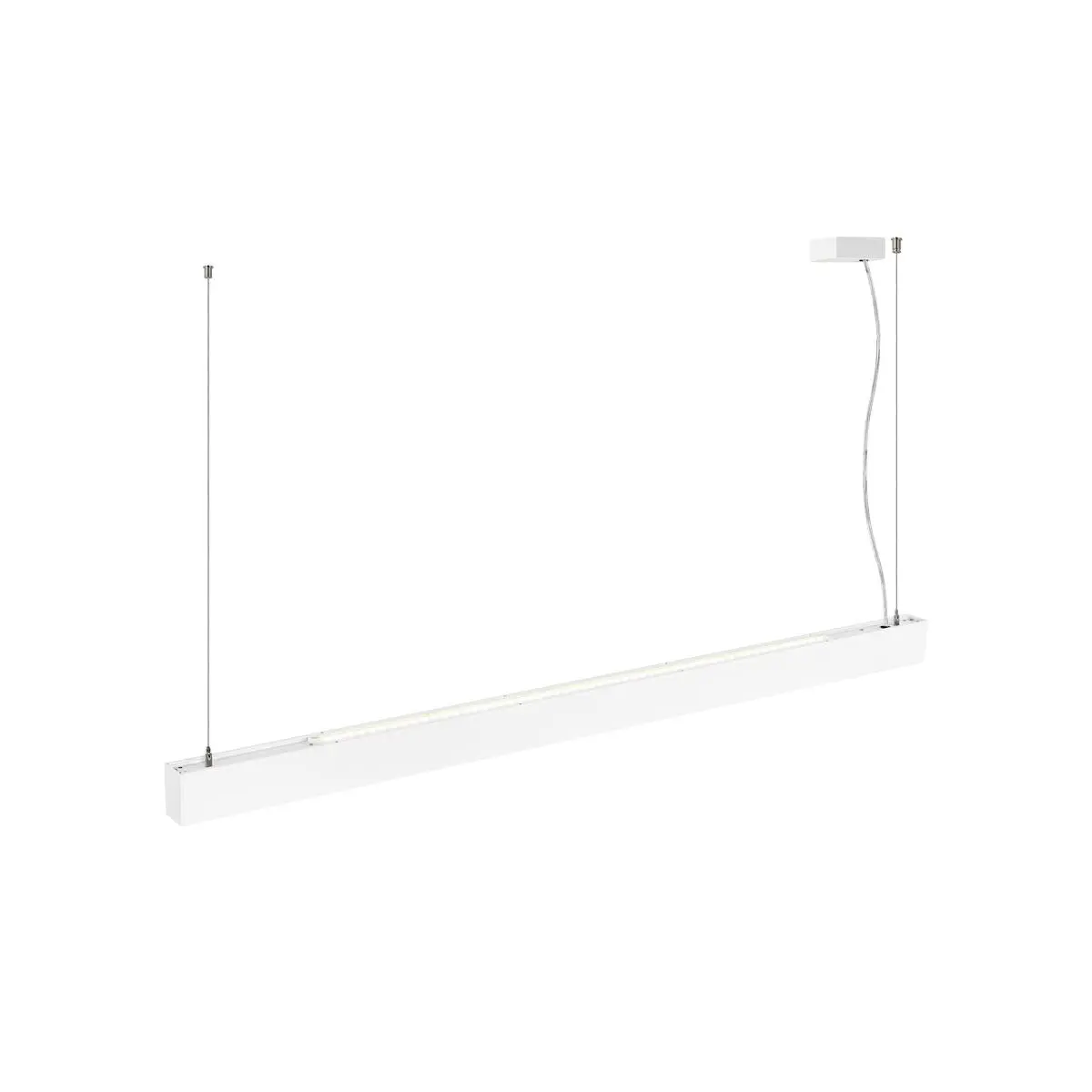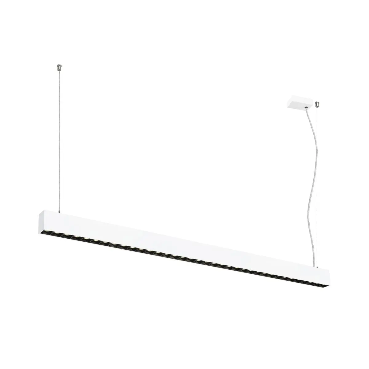SLV Glenos Pro LED-Pendelleuchte 1010515 überzeugt mit einem eleganten, linearen Design, wobei die Kontrast schwarze Lichtquelle leicht rückversetzt ist und mit Mikroreflektor und UGR16 nahezu blendfrei leuchtet. Sie ist mit einem indirekten Lichtanteil versehen, wobei ein Lichtschein nach oben geht und für viel Wohlfühlstimmung sorgt. Als Highlight ist sie durchgangsverdrahtet und wird mit Verbindungsmaterial geliefert, womit sich problemlos bis zu 30 Leuchten nahtlos miteinander verbinden lassen. Die SLV Glenos Pro LED-Pendelleuchte leistet 70 Watt, bei einem Lichtstrom von 9400 Lumen und einer neutralweißen Farbtemperatur in 4000 Kelvin und erzielt so effiziente 134 Lumen pro Watt. Ihre Qualität ist mit 50.000 Stunden in L80B10 hoch, die der Hersteller mit 5 Jahren Garantie absichert. Ausgerüstet mit CRI 90 schafft sie eine natürlich, brillante Farbwiedergabe und lässt sich DALI dimmen. Unsere SLV Glenos Pro LED-Pendelleuchte besitzt ein Leuchtengehäuse aus hochwertigem Aluminium und misst eine Länge von 144.8cm, eine Breite mit 4.8cm sowie eine Höhe in 7.6cm und ist mit einer individuell einstellbaren Pendellänge von 210cm versehen.