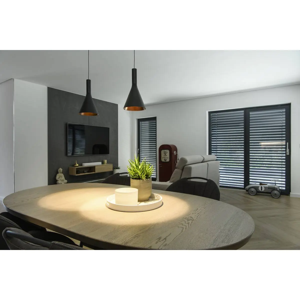 SLV Lalu Set Cone 15 1-Phasen LED-Hängelampe 1010797 kommt mit einem hochwertig verarbeiteten Lampenschirm in eleganter, konischer Form zum Einsatz und ist als Highlight innenseitig in der Trendfarbe Bronze gehalten und setzt über Tresen und Tischen hochwertige Statements. Sie ist dimmbar mit einem Phasenabschnitts-Dimmer und sorgt mit CRI 90 für eine natürlich brillante Farbwiedergabe. Die SLV Lalu Set Cone 15 1-Phasen LED-Hängelampe leistet 9.5 Watt, bei einem Maximallichtstrom von 600 Lumen und ist mittels CCT-Schalter in der Lichttemperatur zwischen 2700 Kelvin und 3000 Kelvin einstellbar. Ihre Qualität ist mit langlebigen 50.000 Stunden in L80B20 hoch, welche der Hersteller mit 5 Jahren Garantie absichert. Unsere SLV Lalu Set Cone 15 1-Phasen LED-Hängelampe trägt ein schwarzes Gehäuse aus hochwertigem Aluminium und Stahl und misst einen Durchmesser von 15.2cm, eine Höhe mit 27cm sowie eine individuell kürzbare Textilleitung in 200cm Länge.